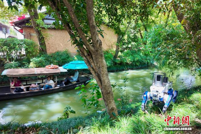 今日公安无人狗正在西溪干天中察看,吸收搭客围不雅。中新社记者 钱朝菲 摄